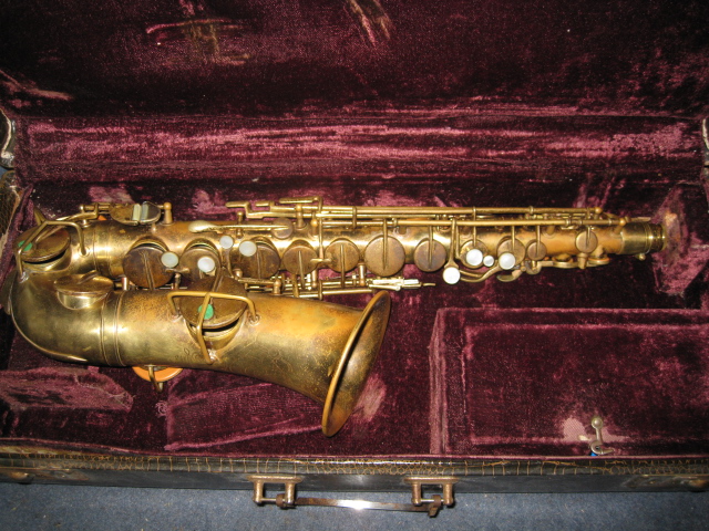 I bought this alto from Magginisupplies, who are based in the West Country. Over the years I have acquired a number of fine instruments from Tony, who is a keen on sailing, so we sometimes meet in the car park of a local reservoir when something interesting comes up. This was one of a couple I bought at the time. What a grand tribute to capitalism it is – to be buying ancient saxophones on a Sunday morning from the back of Tony’s estate car. He has a lot of different instruments for sale, although I believe violins are perhaps his main thing.