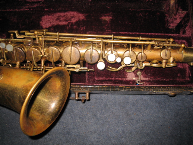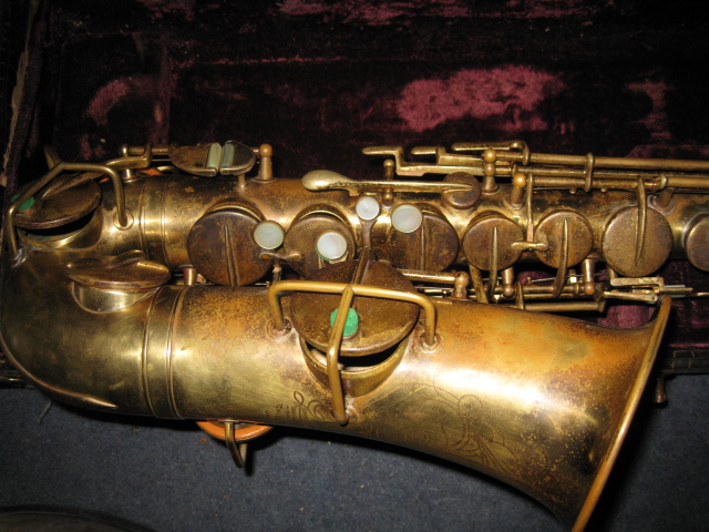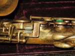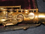 It would be wrong to suppose a saxophone from the 1920s would play as easily as a modern horn. As I noted above, the G#/C# key is a bit heavy under the left hand ‘pinky’ and the pearls feel more widely spaced and harder to depress than on a modern balanced instrument. However the sound is loud and true when played with my Berg Larsen ebonite 6 (with Rico 3 1/2 reed) mouthpiece. It’s certainly not a ‘peashooter’ – a name used to describe early saxophones with a narrow bore towards the neck end and hard to keep in tune in the upper register. I’ve included a video clip of the horn from my saxachronic chamber.