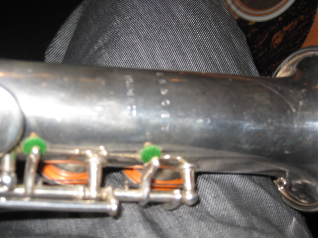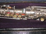 It’s a silver-plated model with a very slight gold shading on the inside of the bell. I’m sure the pearl tops to the keys have been added later, as they don’t all fit exactly over the silver keys underneath which are all flat. It doesn’t affect the playing, which is smooth and surprisingly well balanced for a horn of this age. There’s no F# key on this – hardly necessary for a player like me who struggles to keep a small saxophone in tune towards the middle – let alone the top – of the upper register in any case.