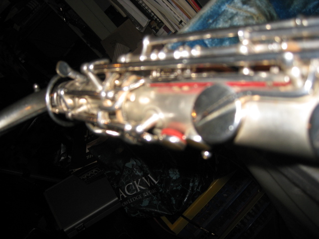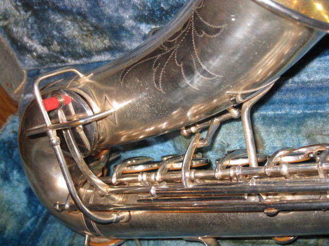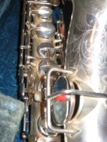 It is a silver-plated horn in excellent condition having been cleaned in a silver-polish bath and supplied with a silver saver in its original case. It is a ‘clapper’ with the bottom keys split between the left and right sides of the bell. It has the classic Martin ‘bevelled’ tone holes of course, which bend in for the last quarter of an inch. There’s no doubt that Martin manufactured any saxophone which has these features. They look better than the rolled tone holes found on Conn instruments, but for the life of me I can’t tell any difference in playing between these two types of tone holes and normal ones.