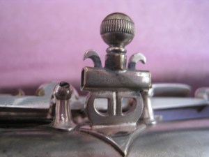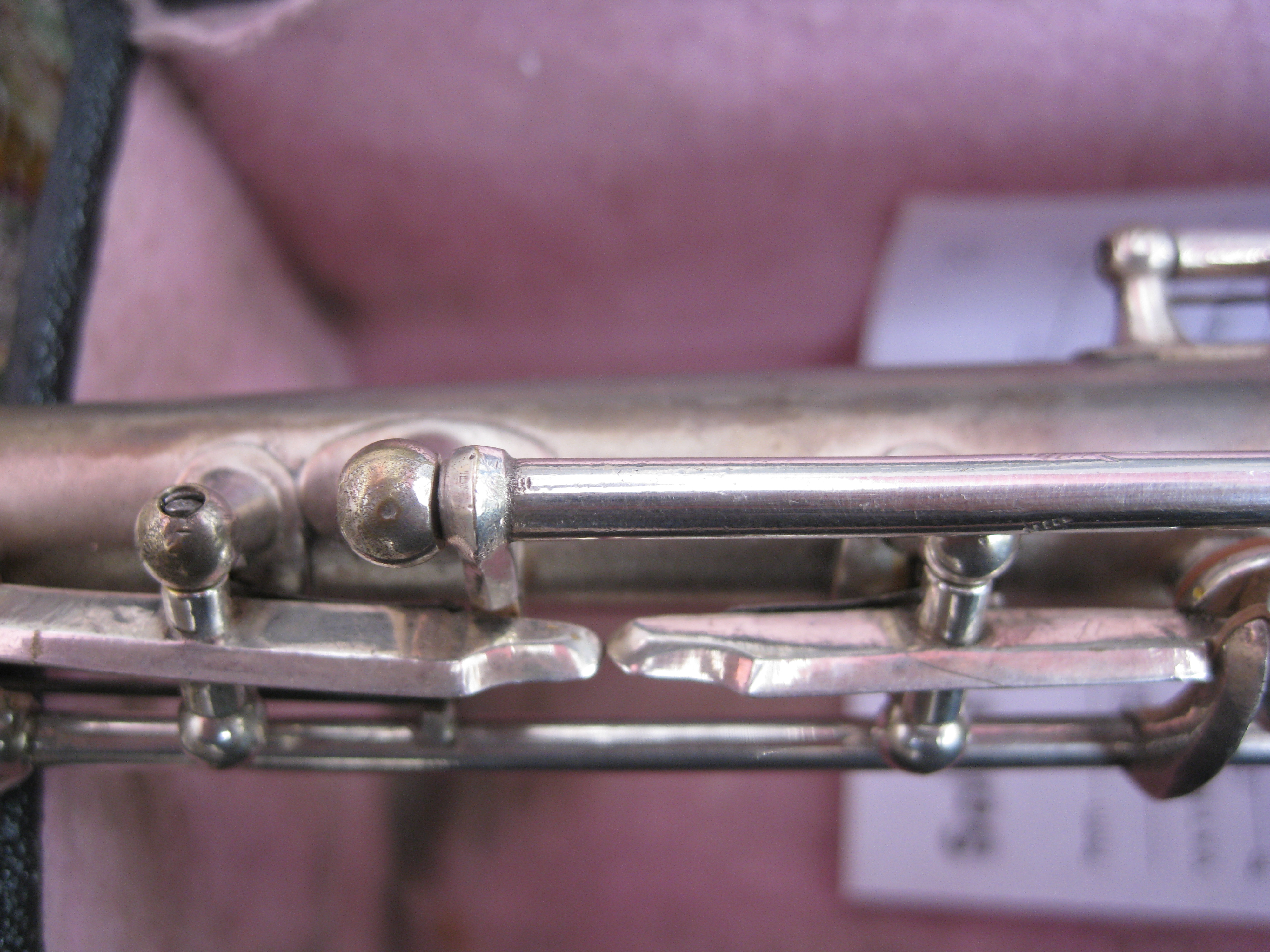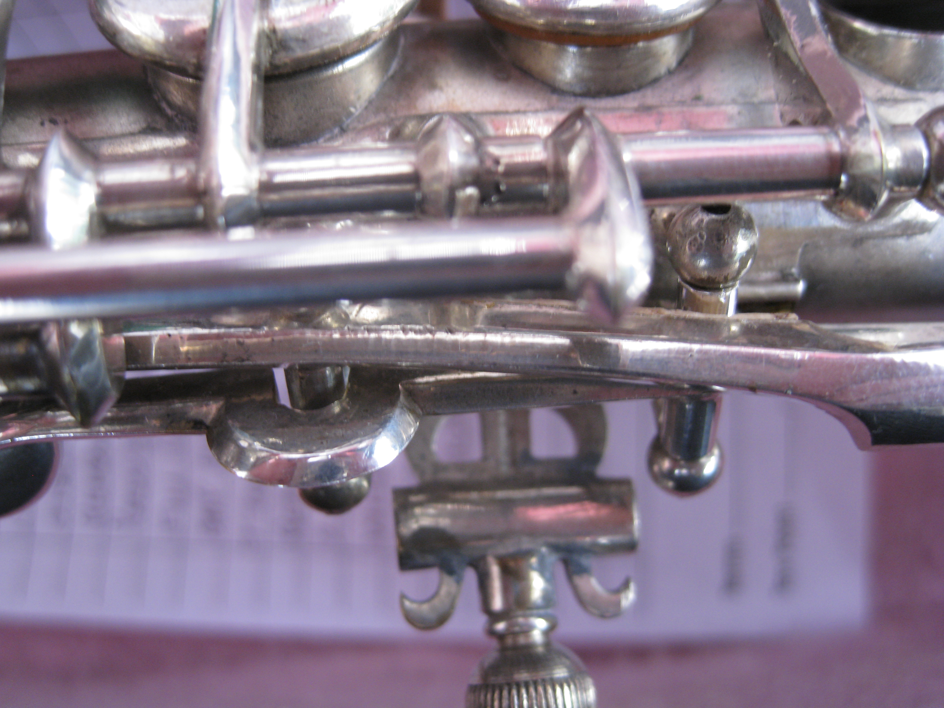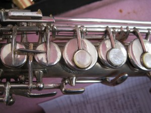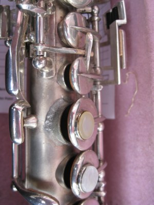 There is no serial number on this and thankfully no sign of one having been rubbed out, which would be the sign of a stolen instrument. It is marked ‘Lyrist Briard Soliste’, ‘Garde Republicaine’, ‘Mark Deposee’ (trade mark) and ‘9 Place du Combat, Paris’. The instrument has seen better days – a number of the tone holes have been soldered back on, reducing the aesthetics. On the positive side it has one of the best music holding clamps I’ve ever seen – modelled in the shape of a lyre of course. Although it lacks the tell-tale bevelled tone holes, it could be a stencil made by Martin. The pinky keys and the font of the ‘LOW PITCH’ stamped on the side are also reminiscent of the Martins I’ve been able to investigate. I even visited the Bate museum in Oxford to get a close look at an AE Sax alto, but can’t say there was much of a similarity with this. As an older instrument there is no F# key and the lack of the extra keywork makes it lighter than more modern sopranos.